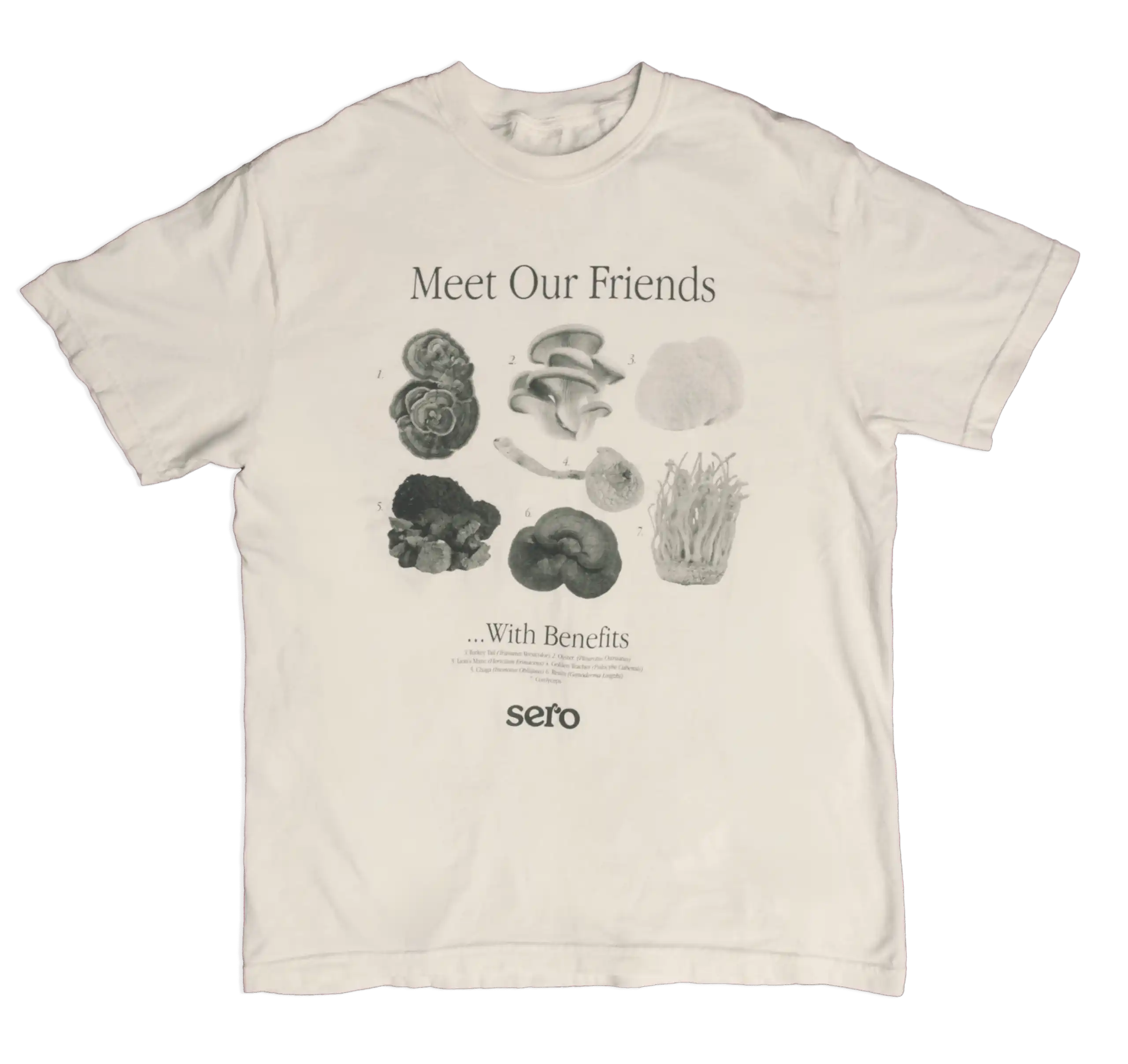 An homage to the various shapes and sizes of our mushroom friends, each with their unique charm and beauty. Exclusive Sero ‘Meet our Friends with Benefits’ graphic T-Shirt printed on front featuring our favourite mushrooms. Printed locally in Toronto.